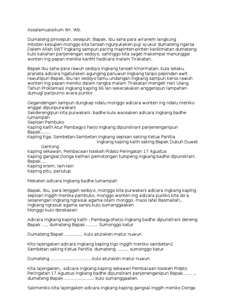 Saya mau minta izin mencuplik materi pranatacara untuk tugas basa jawa nggih. Dengan doa, kedua mempelai bisa bersikap dewasa dan mau saling mengerti untuk kepentingan bersama. Contoh teks pranatacara bahasa jawa acara ulang tahun. Teks pembawa acara sumpah pemuda di sekolah. In universities, especially at undergraduate.
