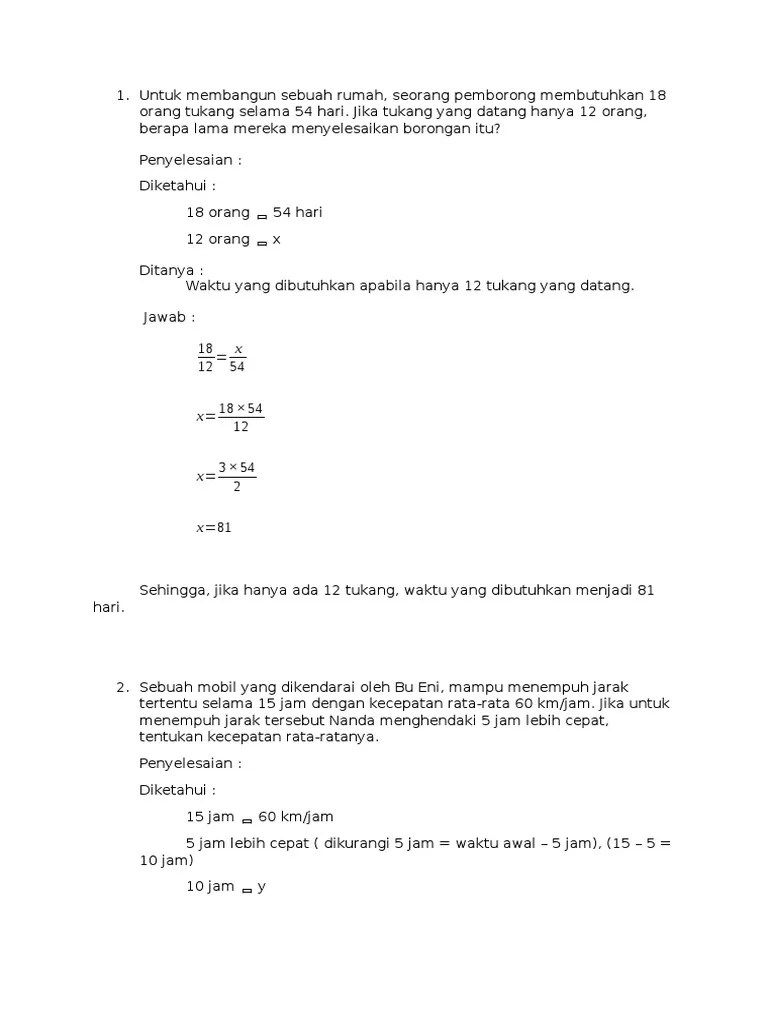 Yaitu mencari waktu penyelesaian pekerjaan. Butuh jawab soal matematika, fisika, atau kimia lainnya? Ini adalah perbandingan terbalik, karena semakin cepat waktu pengerjaan, maka jumlah pekerja yang dibutuhkan akan semakin banyak. Suatu rumah dikerjakan oleh 6 pekerja ,menghabiskan biaya untuk menggajihnya sebesar rp 300.000 ,00. Seorang pemborong mampu menyelesaikan pekerjaannya selama 49 hari dengan 64 pekerja.